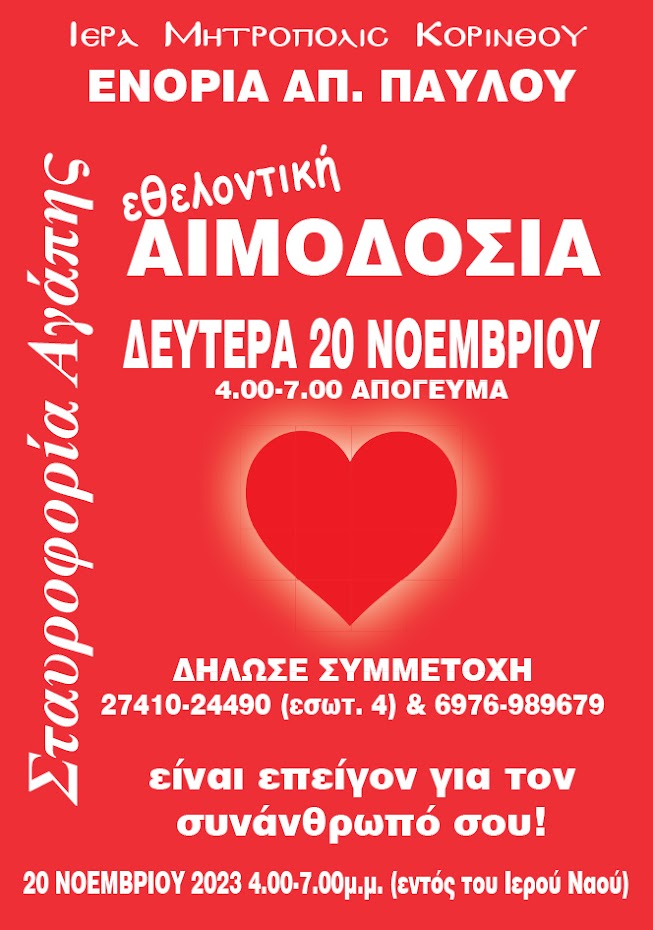 Κάποια στιγμή στη ζωή μας ΟΛΟΙ ΜΑΣ ΜΠΟΡΕΙ ΝΑ ΧΡΕΙΑΣΤΟΥΜΕ ΑΙΜΑ. ΄Αν Θέλεις να νιώσεις όμορφα, ΄Αν Θέλεις να δώσεις χαρά, Άν θέλεις να μιμηθείς τον Χριστό, που είναι πάνω στο Σταυρό Ο ΜΕΓΑΛΟΣ ΑΙΜΟΔΟΤΗΣ για ΄μάς, ΔΩΣΕ ΜΕ ΑΠΟΛΥΤΗ ΑΣΦΑΛΕΙΑ, ΛΙΓΟ ΑΠΟ ΤΟ ΑΙΜΑ ΣΟΥ, ΧΩΡΙΣ ΚΑΝΕΝΑ ΚΙΝΔΥΝΟ. Η αιμοληψία γίνεται από ειδικούς γιατρούς. ΛΙΓΑ ΛΕΠΤΑ ΜΟΝΟ ΑΡΚΟΥΝ, για το πιο πολύτιμο δώρο, που μπορεί να προσφέρει μόνο ο άνθρωπος σε άνθρωπο. Η ποσότητα του αίματος, που δίνει ο αιμοδότης αντιπροσωπεύει περίπου το 1/13ο του συνολικού αίματος του σώματός του και αναπληρώνεται από τον οργανισμό μέσα στα επόμενα μόλις 10 λεπτά. Μπορείς να δώσεις αίμα αν είσαι, από 18 μέχρι 65 ετών τρείς φορές το χρόνο και έτσι, τόσο ο ίδιος όσο, και οι πρώτου βαθμού συγγενείς σου μπορούν να το χρησιμοποιήσουν όποτε χρειασθεί.ΠΛΗΡΟΦΟΡΗΣΟΥ ΚΑΙ ΔΗΛΩΣΕ ΣΥΜΜΕΤΟΧΗ ΣΤΗ ΣΤΑΥΡΟΦΟΡΙΑ ΑΥΤΗ ΤΗΣ ΑΓΑΠΗΣ,καθημερινά στο τηλέφωνο του Ι.Ν. 27410-24490(εσωτ. 4) και κιν. 6976-989679 (κ. Νικ. Κτενάς)ΑΙΜΟΛΗΨΙΑ: Δευτέρα 20 Νοεμβρίου 2023,4:00-7:00 το απόγευμα.ΙΕΡΟΣ ΝΑΟΣ ΑΠ. ΠΑΥΛΟΥΕΝΗΜΕΡΩΣΕ ΟΣΟ ΜΠΟΡΕΙΣΠΕΡΙΣΣΟΤΕΡΟΥΣ